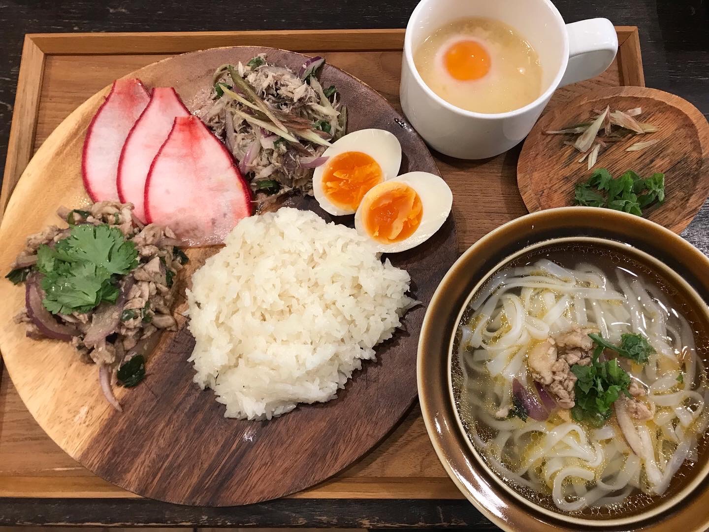フォーのスープはラープを煮ただしを使い、調整したものとのこと。アジアンテイストで、こちらもなかなかおいしい。麺を食べた後に、先ほどのお米を入れ、温泉たまごを入れて食べるのが、田心カフェおすすめの食べ方。いわゆる締めのおじやです。